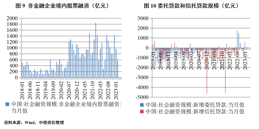 非標融資同比環比均有一定增幅,成為一季度社融增量的另一支撐。其中,1~2月新增委託貸款與信託貸款規模分別為507億元、4億元,較去年同期分別多增153億元、1,435億元,其中新增信託貸款規模繼2020年以來首次為正。