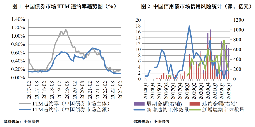 2023年一季度,債券市場信用風險持續暴露,風險規模環比有所下降,但同比有所抬升。從實質違約角度,一季度,債券市場信用債違約企業共計9家,其中新增違約企業3家,涉及債券違約10只,違約規模112.08億元,主體及金額TTM違約率仍保持低位水平。新增違約企業為榮盛地產、金科地產和恆大地產,均屬於前期展期主體的風險持續暴露。從展期角度,一季度,國內債券市場信用債展期企業共有18家,其中新增展期企業3家,涉及展期債券41只,展期規模514.78億元,展期規模環比有所下降,但同比大幅提升。從整體角度,一季度,債券市場違約及展期債券規模合計626.86億元,環比下降約10%,但同比增長155%,風險暴露仍主要集中在地產行業[1]。