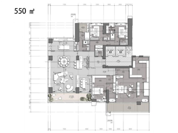 面積約550㎡四房,1號樓高區四房户型,獨梯入户對景玄關,超展開主卧,功能齊全;公私區雙陽臺,270°無敵視野;沉浸式展廊,彰顯主人風采,還配有酒吧、茶吧以及超尺度方廳最大化滿足社交需求,可以説是平層「豪宅」。