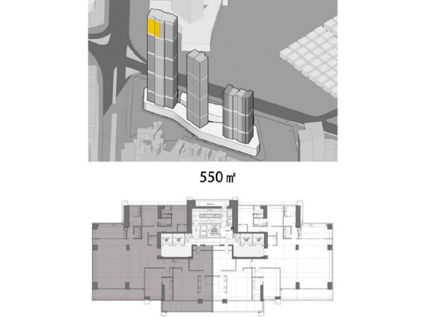 其中1號公寓、商業樓,共67層,樓高245米,1號樓低區每層三户,高區每層兩户,每一户都是獨梯入户對景玄關,總共有三種戶型,分別是低區的280㎡四房、390㎡四房以及高區的550㎡四房。
