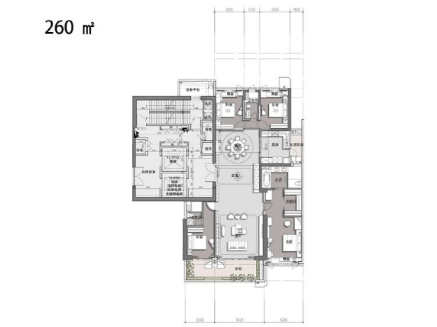 260㎡的四房位於3號樓的中間位置,3號樓採用四梯(含貨梯)四户,每兩户共用兩梯。建面約260㎡的户型亮點:獨梯入户對景玄關、經典豎廳户型、少過道、高使用率、超尺度景觀陽臺等,經濟改善型首選。