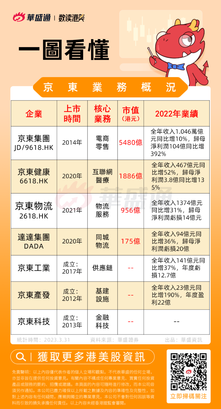 目前,京東系已有四家上市公司,分別為2014年赴美上市的京東集團、2020年赴美上市的達達集團、京東健康 $06618.HK ,以及2021年赴港上市的京東物流。