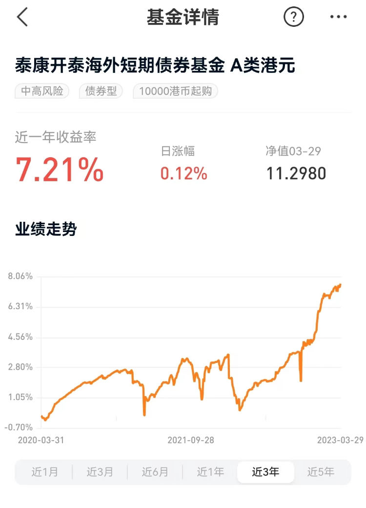 3、基金收益大幅跑贏同類產品。在過去的六個月/一年/三年中,該基金的收益均超越跑贏同類基金。在2022.4.1至2023.2.28期間,泰康開泰海外短期債券基金收益為6.74%,同期的0-3個月美國國債指數收益僅為1.70%,1-3年美國國債指數僅為-1.13%。該基金的投資經理表現出優秀的投資能力。