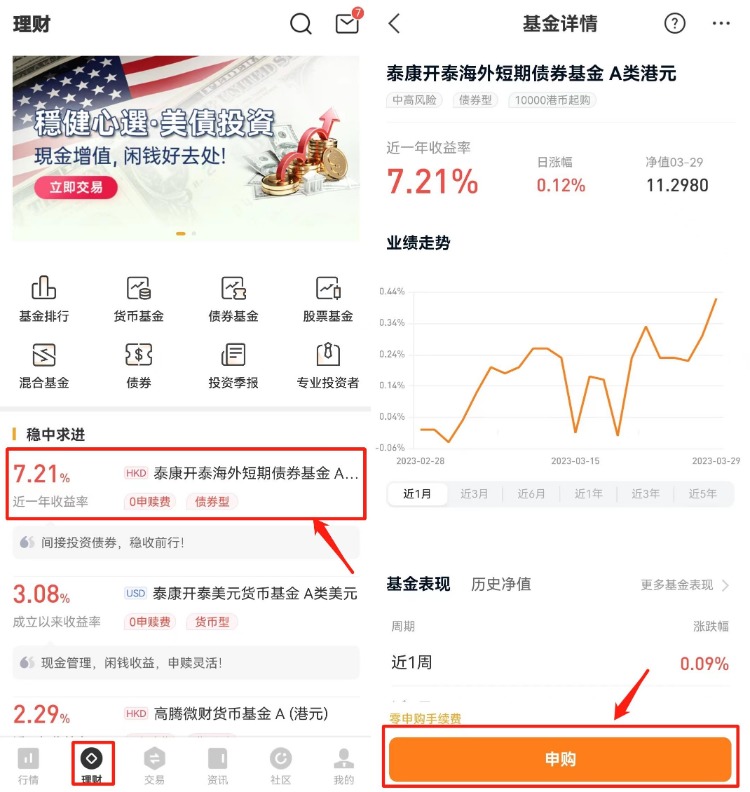 方法如下,打開華盛通APP,點擊理財欄目,在穩中求進欄目頂部的就是這一基金,點擊后可進入申購頁面,點擊底部申購按鈕,即可0手續費申購。申贖時間為每個交易日的下午5:00之前,走過路過,不要錯過哦。