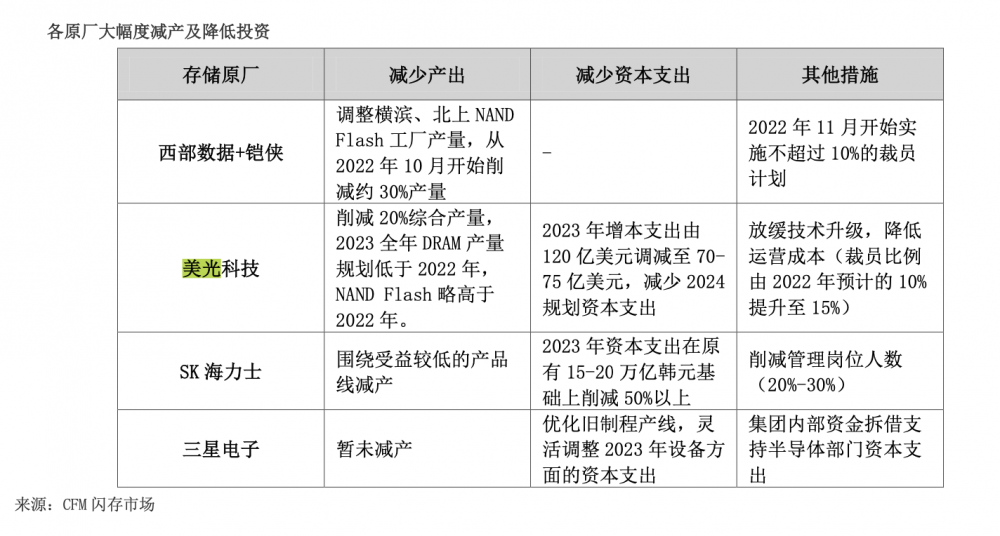 在市場壓力下,三星、美光、SK 海力士、西部數據都宣佈將於2023年大幅度削減資本開支甚至減產。比如Sanjay Mehrotra表示,預期今年投資約70億美元,同比2022年減少超40%,2023年晶圓廠設備資本支出預計將年減超過50%,2024年預計進一步縮減。