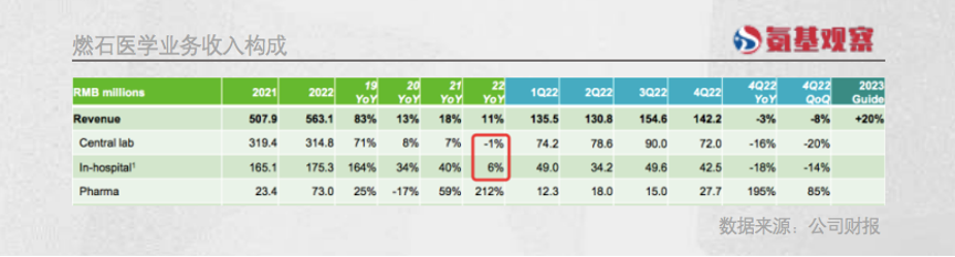 而在業績增速方面,這兩項業務出現了明顯的分化。在同樣是疫情、競爭加劇等因素影響之下,其中心實驗室服務收入同比下滑1%,院內業務收入規模則增長了6%。