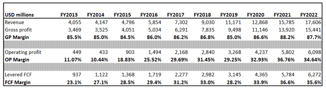 收入以 17.7% 的複合年增長率從 2013 財年的約 40 億美元增長到 2022 財年的超過 170 億美元。令人印象深刻的 85.5% 的毛利率在十年間進一步擴大至 87.7%。其他盈利指標,包括槓桿自由現金流 [FCF] 利潤率,也是一流的。