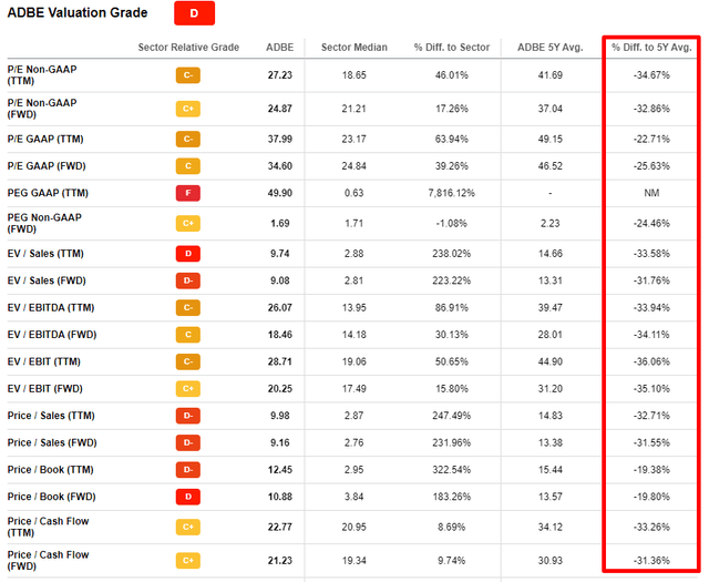從估值比率的角度來看,Seeking Alpha Quant評級表明,考慮到整體「D」等級,該股被嚴重高估。但是,與同行相比,像Adobe這樣獨特的盈利明星以顯着溢價交易是公平的。在這里想強調的是,在倍數分析中,將 Adobe 當前的估值比率與公司最近的平均水平進行比較會更合理。這一比較表明,該股目前的交易價格大大低於歷史市盈率。