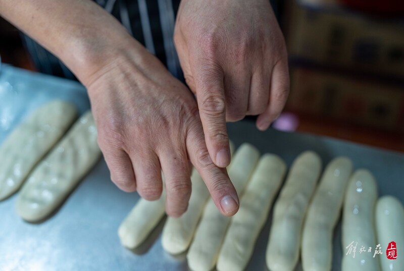 直到親眼看到王永新做餅,才明白他做的葱油餅為什麼這麼香。在店內的鋁皮案板上,他將搓成十多個長條形麪糰壓扁,再用擀麪杖將它們擀得長而薄,表面塗上用豬油、麪粉和調料做成的油酥,邊塗邊拍邊壓實,讓油酥的味道充分沁入麪皮。因為常年重複這個塗油酥的動作,王永新最受力的右手食指有些扭曲。