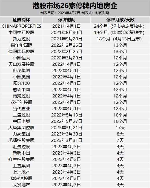 截至4月7日,除了新力控股,仍有25家主營業務包括住宅開發的內地房企處於停牌狀態, 這些房企大多數因無法按時披露業績而停牌,包括融創中國、中國恆大、中國奧園、陽光100、花樣年控股、旭輝控股集團、祥生控股集團和上坤地產等。