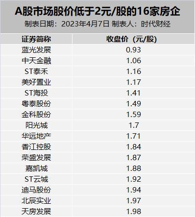 截至4月7日,A股市場雖僅有藍光發展一家房企股價低於1元/股且淨資產為負,但另有15家房企的收盤價已跌破2元/股,包括中天金融、ST泰禾、美好置業、ST海投、粵泰股份、金科股份、陽光城、華遠地產、香江控股、榮盛發展、嘉凱城、ST雲城、迪馬股份、北辰實業、天房發展,大部分房企股價已徘徊在此區間至少一年。