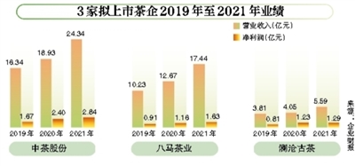 從目前擬上市的三家茶企業績表現來看,瀾滄古茶、八馬茶業、中茶股份2021年營收分別為5.59億元、17.44億元、24.34億元,淨利潤分別為1.29億元、1.63億元、2.84億元,三家茶企的市佔率均不足1%。另據新京報記者不完全統計,過往及現存19家新三板掛牌茶企中,以摘牌前最后一個完整財年報告為基準,營收過億的僅有七彩雲南、謝裕大、美靈寶、松蘿茶業、茗皇天然5家企業。
