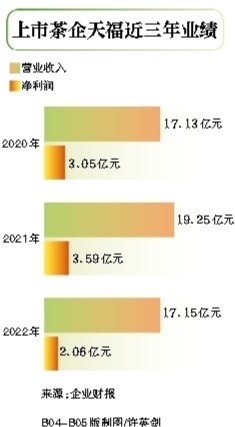 與我國茶葉產銷大國的地位相比,我國茶企業績體量普遍偏小。以港股茶企「獨苗」天福為例,憑藉全品類佈局、門店開拓、店面管理等在當時領先於同行的運營手段,天福營收規模在上市前后迎來兩級跳,從2009年的6.93億元增長至2010年的12.47億元,2011年增至17.53億元。然而完成上市后,天福業績始終停滯不前,2012年—2020年各期營收均未突破18億元。受疫情影響,天福2022年營收下降10.87%,至17.15億元,淨利潤下降42.57%,至2.06億元。