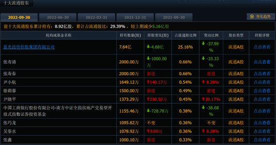 截至去年三季度末,在藍光發展的十大股東名單中,張壽清和張壽春兩人在列,持股數量均為2000.00萬股,張宇並不在其中。這也表明,牛散們或在股份過户后快速拋售套現。