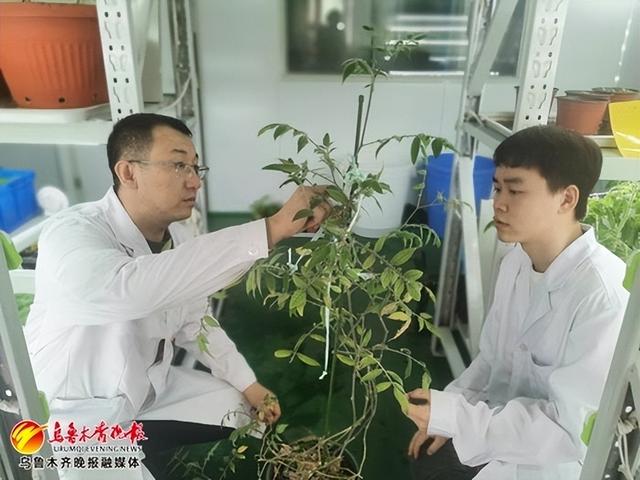 新疆農業科學院園藝研究所副研究員李寧與團隊成員正在育苗室查看番茄種苗生長情況。記者江斌偉攝