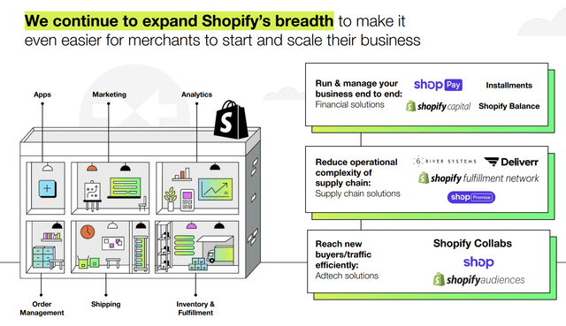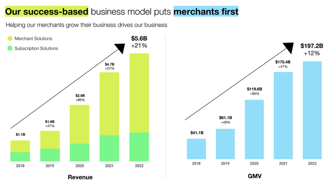 Shopify是一個位於加拿大的一站式SaaS模式的電商服務平臺,為電商賣家提供搭建網店的技術和模版,管理全渠道的營銷、售賣、支付、物流等服務。自2006年由TobiasLütke創立以來,該公司已發展成為全球最大的電子商務公司之一,年交易額達2200億美元。該公司還通過ShopifyFulfillment、ShopApp、CommerceComponents等解決方案大幅擴展了其產品範圍。儘管取得了這些進展,但分析師相信仍有大量的擴張機會,因為電子商務仍處於起步階段。