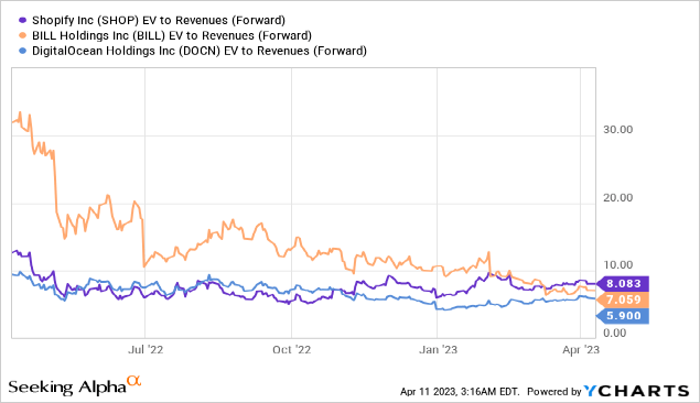 相信Shopify從長遠來看處於有利地位,這要歸功於有利的市場趨勢和持續向企業客户的轉變,這應該會釋放更多的增長機會。然而,近期的擔憂讓人對這家公司持謹慎態度。由於利率上升,經濟一直在迅速走弱,而由於其基於交易的模式,需求放緩應該會嚴重影響公司的收入。與同業相比,其估值較高也可能限制近期上行空間。