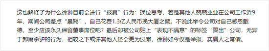 市場人士猜測,這也解釋了為什麼徐翀會進行「報復」行為。徐翀在公司兢兢業業工作8年,還在公司上市的關健時刻自掏腰包,花費1.3億元。而公司不僅沒有還錢,還把他以評分極低的方式踢出了公司,自然令人氣憤。