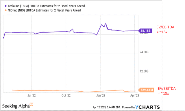 如果你比較蔚來的1年遠期市銷率0.893倍,它似乎遠低於特斯拉的4.4倍——但是,不建議所有看漲蔚來的人都降低損益,以免感到不安。如果我們查看未來2年的EBITDA預估數字,並從當前的企業價值推導出這兩家公司的估值,蔚來被高估了20%: