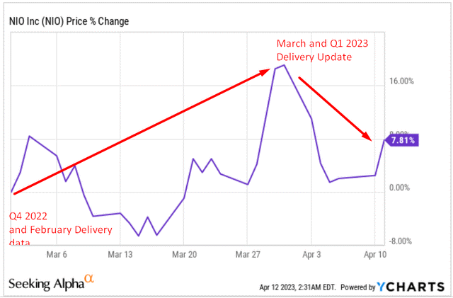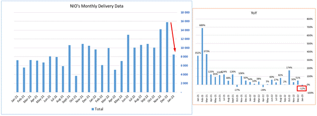 儘管對國內開放充滿希望,對高端汽車的需求急劇增加,但蔚來在2023年3月僅交付了10,378輛汽車,這是多個月以來交付量首次同比下降: