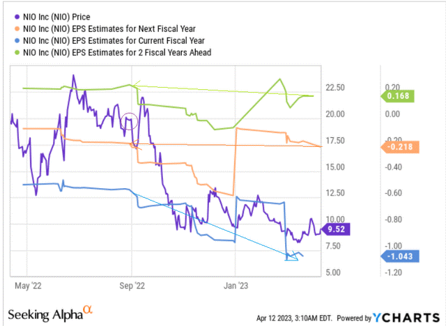如果您查看去年動態中的EPS修訂,其中蔚來下降了約52%,您會發現當前對未來EPS數字[FY24和FY25]的估計回到了2022年中期的水平,當時蔚來股票的交易價格約為19-20美元: