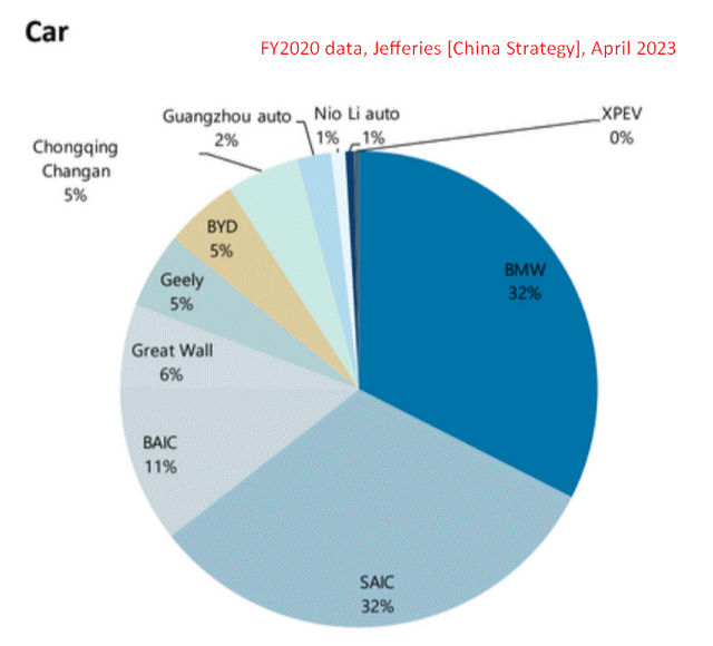 Jefferies的圖表看起來有點過時。在2022日曆年,蔚來交付了122,486輛汽車,而整個國內NEV(新能源汽車)市場的銷量為6.89輛[同比增長93.4%]。也就是説,蔚來在2022財年佔新能源汽車市場總量的1.78%左右,佔國內汽車市場總量的0.46%左右[2686萬輛]。