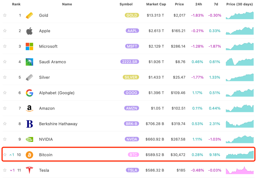 另據8marketcap數據,由於比特幣價格已經升至3.05萬美元附近,比特幣市值已達到5895.2億美元(約合人民幣4萬億元),日前超越特斯拉重返全球市值前10大資產/公司。今年以來,比特幣價格連續上漲,截至目前漲幅超80%,重返2022年5月以來的高位。