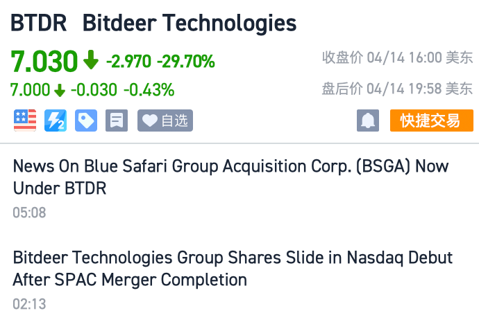 4月14日,日前與空白支票公司Blue Safari Group Acquisition Corp完成合並的礦機共享服務平臺——比特小鹿,在美國納斯達克上市,股票代碼為「BTDR」。上市首日,比特小鹿股價大跌29.7%,收於7.03美元/股。