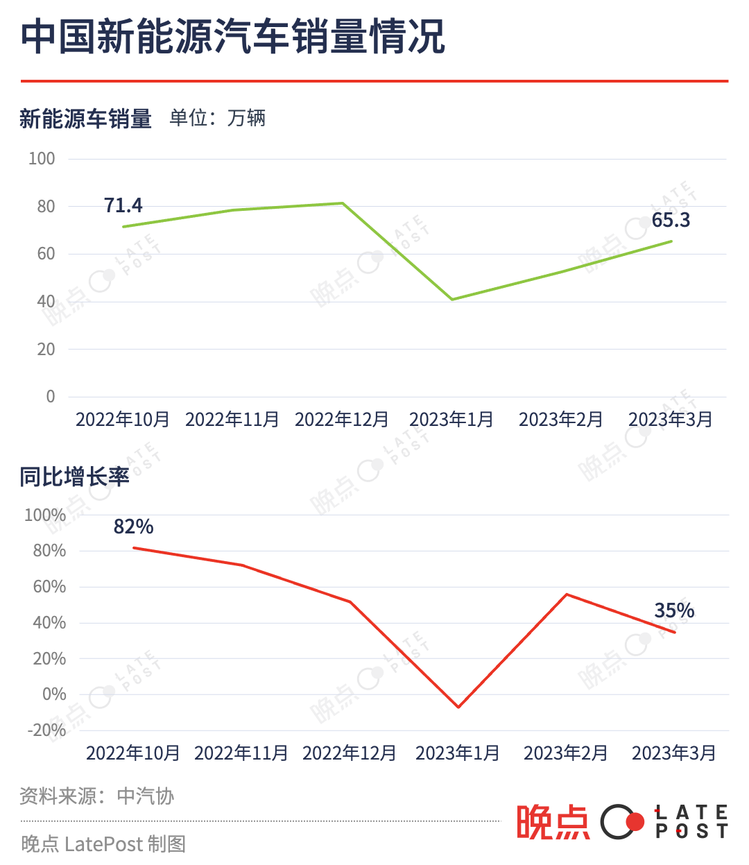 直接原因是,新能源車的銷量增勢在去年底開始轉折。2022年11月新能源車銷量同比增速跌至70% ,比10月少了10個百分點,12月進一步下滑到不足50%。而從歷史數據看,年底特別是12月應該是車市最旺季。