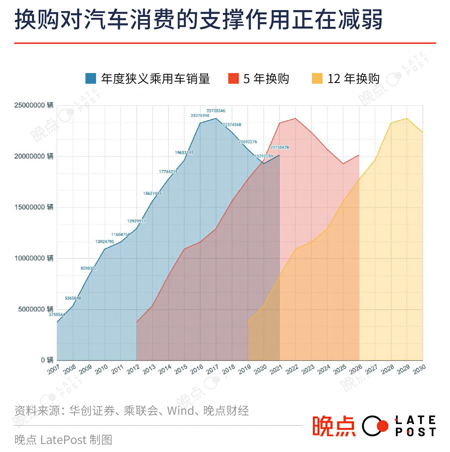 包含燃油車在內,整個汽車市場的增長還受換購周期影響。消費者一般五年左右換購一次汽車,中國乘用車市場的上一個銷量高峰是2017年,全年賣出2373萬輛乘用車,此后乘用車銷量逐年下跌,到五年后的2022年重新增長,來到2356萬輛。以五年的換購周期看,2023年起,乘用車大盤可能再次進入增長趨緩乃至下滑周期。作為乘用車銷量一部分的新能源車也被影響。