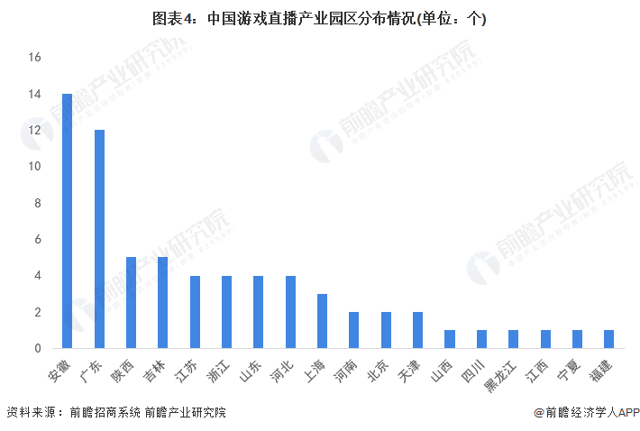 截至2023年3月,我國遊戲直播產業園區共有67個,主要分佈在安徽、廣東、陝西與吉林等地,其中安徽省分佈產業園區最多,共有14個,其次為廣東省,共有12個。
