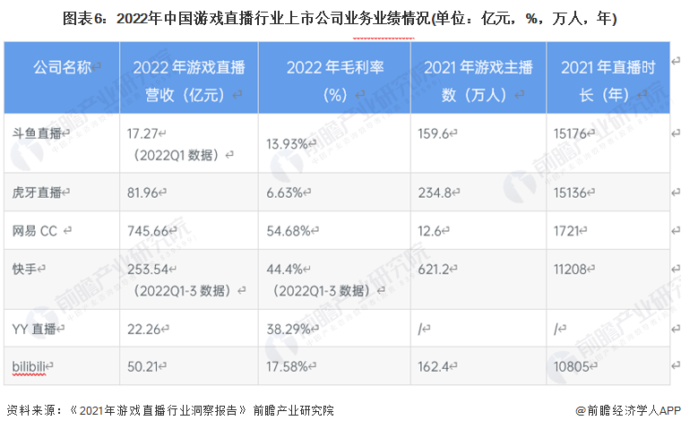 從2022年遊戲直播營收角度分析,網易CC遊戲直播營收最多,為745.66億元;從2022年毛利率角度分析,網易CC與快手毛利率最高,分別為54.68%與44.4%;從2021年遊戲主播角度分析,快手遊戲主播最多,為621.2萬人;從2021年直播市場角度分析,鬥魚直播與虎牙直播直播時長較多,分別為15176年與15136年。