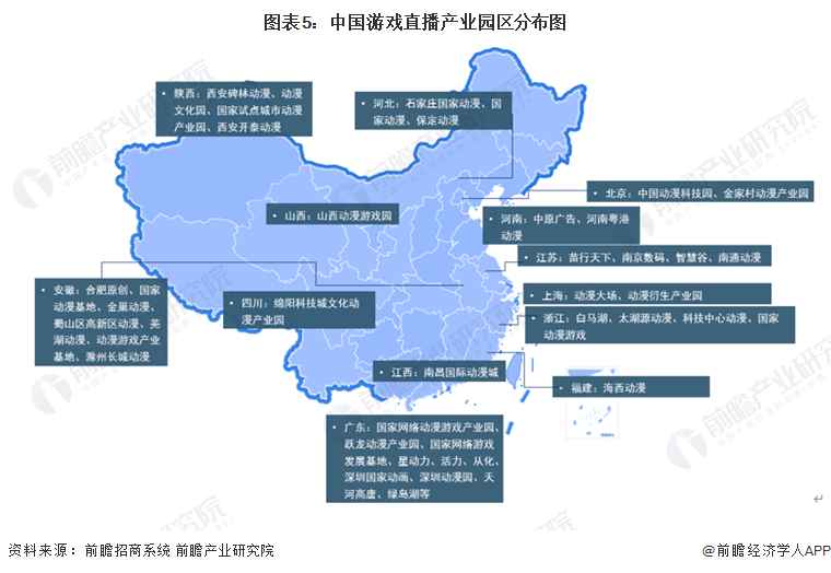 中國遊戲直播企業主要分佈在廣東與浙江地區,廣東代表性企業有虎牙直播、網易CC與企鵝電競等;浙江地區代表性企業有電魂網絡、完美世界與湯姆貓等。