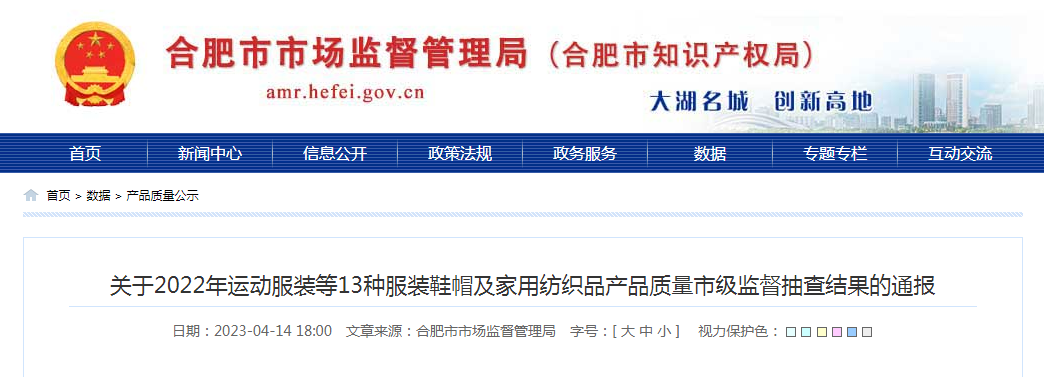 中國質量新聞網訊 2023年4月14日,合肥市市場監督管理局網站通報2022年運動服裝等13種服裝鞋帽及家用紡織品產品質量市級監督抽查結果。