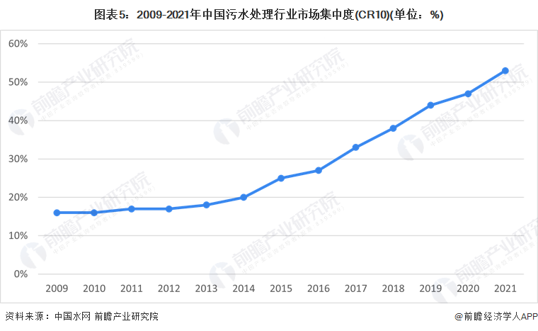 2014年以來,污水處理行業市場集中度呈現上升的趨勢,據中國水網數據,2021年,中國市政污水市場化佔比為45%,市場集中度(CR10)達到53%。隨着我國環保產業的快速發展,污水處理市場規模將不斷擴大,產業市場化服務需求增長,行業將呈現資源整合與跨區域發展的趨勢,在規模效應的推動下,行業領先企業規模擴張速度加快,行業的集中度將逐步提高。