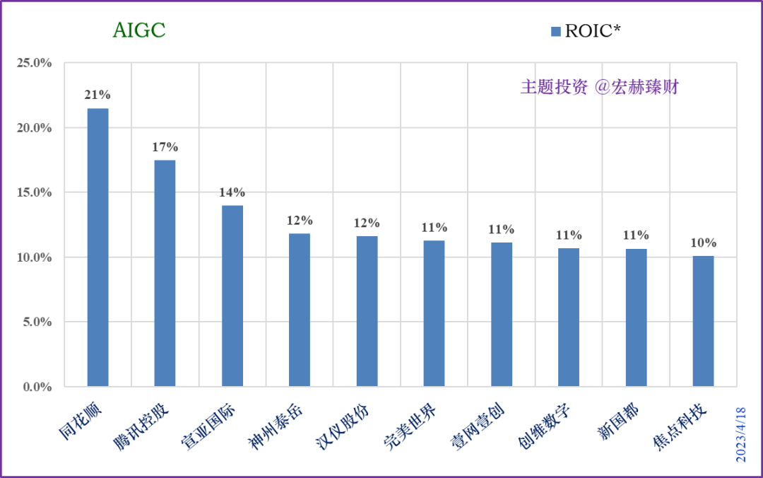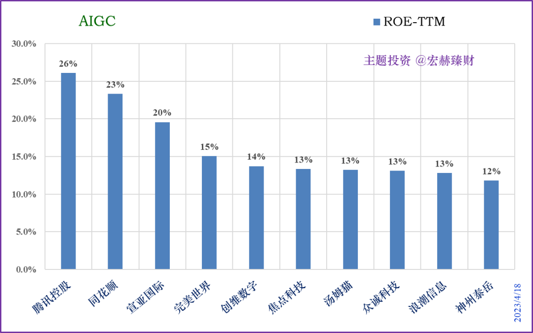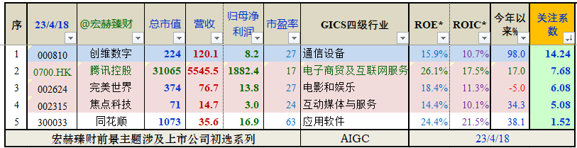 宏赫臻財根據行業特性,在76家「AIGC」概念涉及上市企業中,先篩選未來三年一致預期ROE值大於12%的企業;再篩選出ROE、ROIC兩指標均值大於12%的企業;最后剔除指標異常值,最后剩余【5】家。(金融、地產類公司ROIC不做參考)