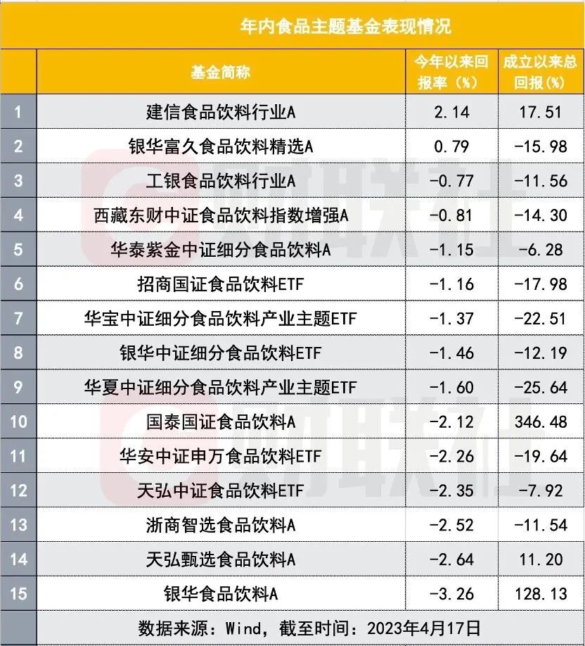 Wind數據顯示,截至4月17日,市場15只「食品」主題基金中僅有建信食品飲料行業、銀華富久食品飲料精選兩隻基金收益率為正,分別微漲2.14%、0.79%。當然,虧損方面也並不嚴重,回報率最差的銀華食品飲料年內回報率為-3.26%。
