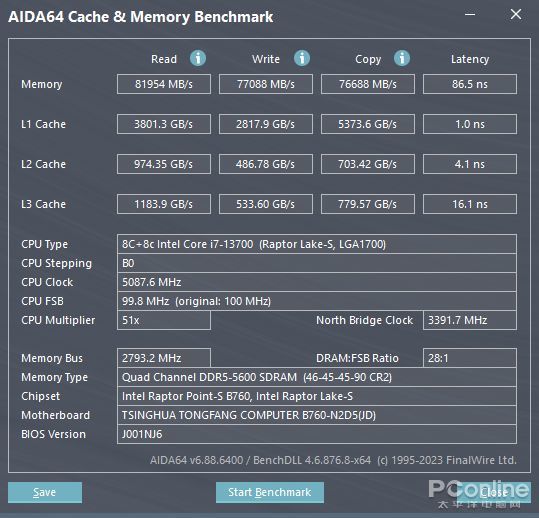 通過AIDA64的Cache&Memory測試,在Corei7-13700處理器搭配高頻DDR5內存的帶動下,內存讀寫及複製延迟性能分別為81954MB/s、77088MB/s、76688MB/s和86.5ns。整體表現可以很好地發揮出硬件自身應有的性能水平以及數據交互處理效率。