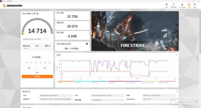 3DMark理論性能測試,其中反應DX11遊戲性能的FireStrike項目中,顯卡分數為15730,物理分數為35073,綜合分數為6248,總分為14714。