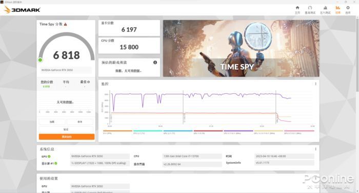 在反應DX12遊戲性能的TimeSpy項目中,顯卡分數為6197、CPU分數為15800,總分為6818。