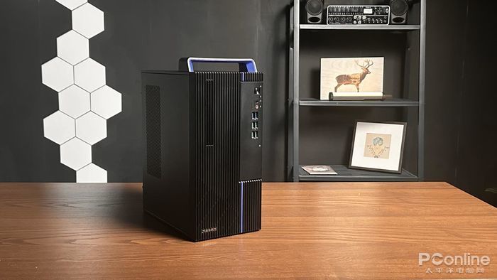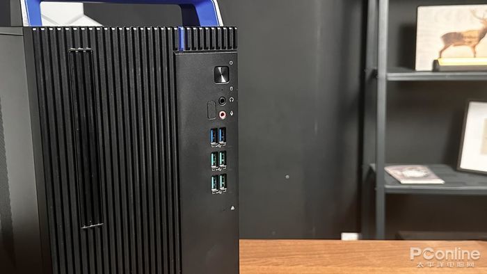 機身前部有豎向排列有電源鍵、3.5mm耳機麥克風二合一接口、6個USB3.2接口以及2個audio接口,大大方便了用户接駁各類輸入輸出設備以及存儲設備,即使同時接駁多個設備也不會因為接口不夠而被迫移動機箱去后面板尋找接口。