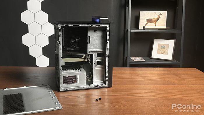 在機身正面,設計了大面積傾斜柵格進風口,不僅美觀,而且還方便通風散熱。這款產品的拆機非常簡單,只需要手動擰下2顆設計在機身后部的螺釘,即可拆開機箱。