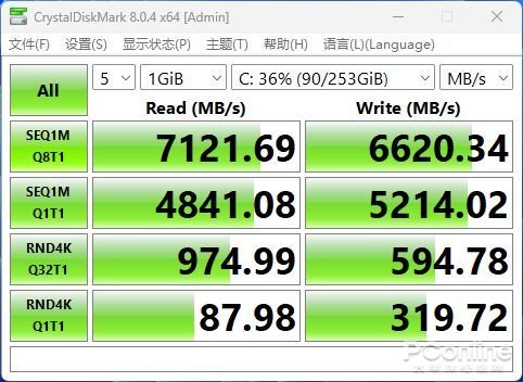 本次測試的超越E500採用了PCIe4.0SSD。通過CrystalDiskMark測試來看,其順序讀取速度為7121.69MB/s,順序寫入速度為6620.34MB/s,達到高端PCIe4.0SSD的水準,面對日常的辦公完全足夠。