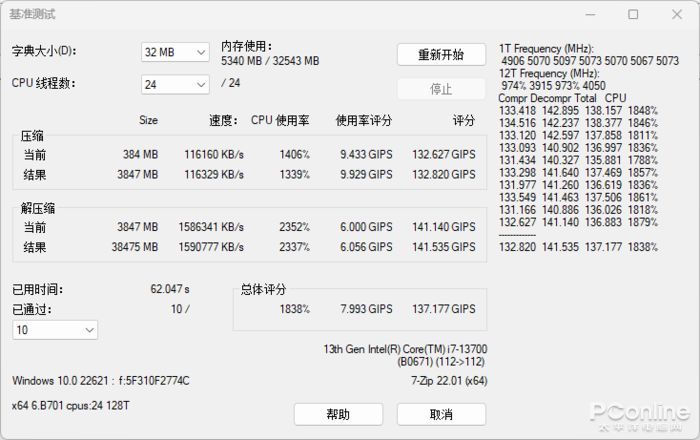數據壓縮和解壓縮測試,軟件能對酷睿i7-13700處理器中24個核心線程進行全面測試,在壓縮和解壓兩種模式測試里面,平臺硬件在進行壓縮時速度116329KB/s,而解壓則能達到1590777KB/s,總評成績部分,CPU使用率為1838%、使用率評分為7.993GIPS,總體評分為137.177GIPS。