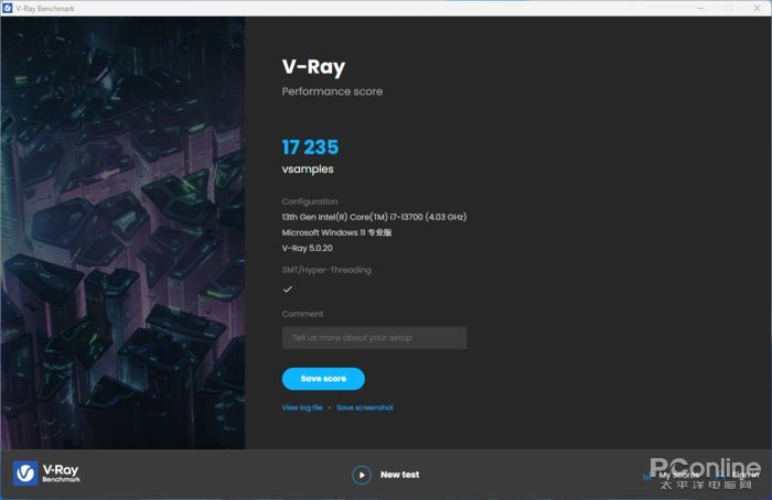 3DMax、Maya等3D建模軟件,都有着以V-Ray內核開發的動畫渲染。VrayBenchmark是Vray渲染插件的性能測試工具,實測該機的i7-13700可達17235vsamples。