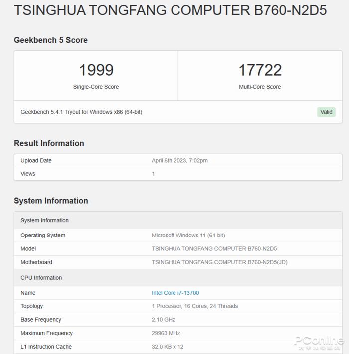 在測試跨平臺處理器性能的Geekbench5上,i7-13700單線程分數為1999,多線程分數為17722。