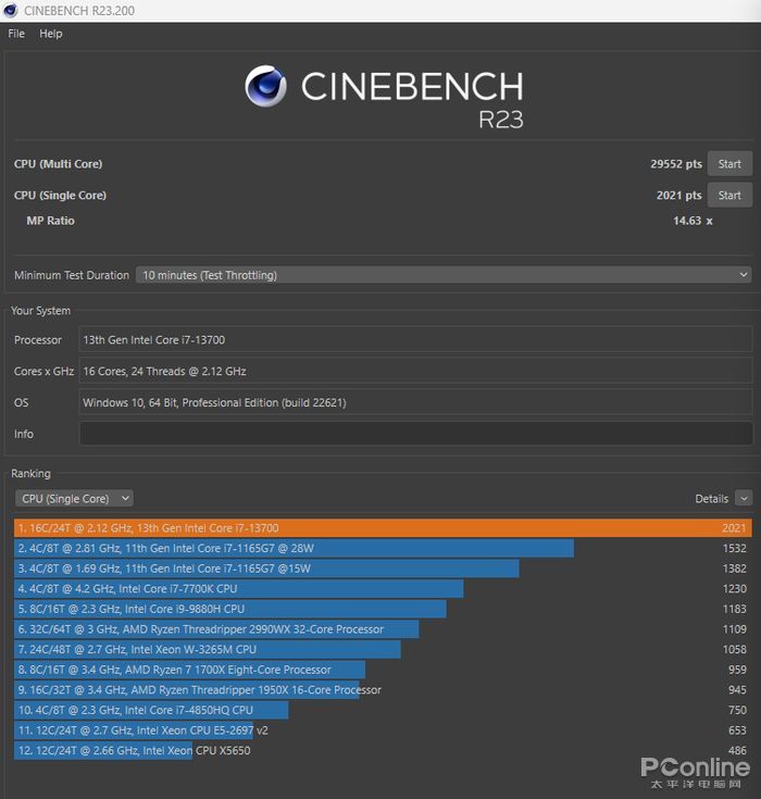 CinebenchR23基於Cinema4D開發,用於測試處理器渲染能力。在測試中,i7-13700單線程得分為2021pts、多線程得分為29952pts。