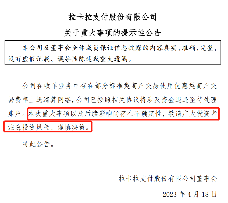 拉卡拉公告,公司在收單業務中存在部分標準類商户交易使用優惠類商户交易費率上送清算網絡,公司已按照相關協議將涉及資金退還至待處理賬户。