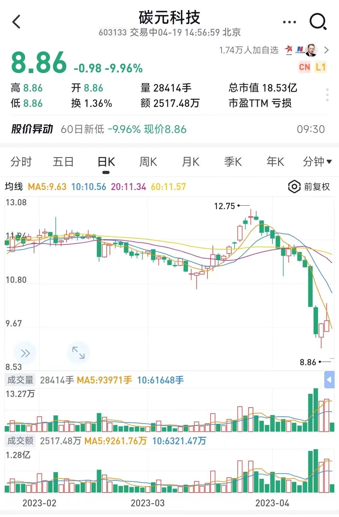 碳元科技也發佈業績預告更正公告,並表示將可能在 2022年年度報告披露后被實施退市風險警示(在公司股票簡稱前冠以「*ST」字樣)。碳元科技開盤也是一字跌停。