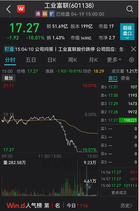 消息面上,工業富聯公司自身並無明顯利空。還有市場傳言稱「工業富聯丟了服務器的大單」;也有網友分析表示,工業富聯午后表現與大盤一致,「就是之前漲多了!」